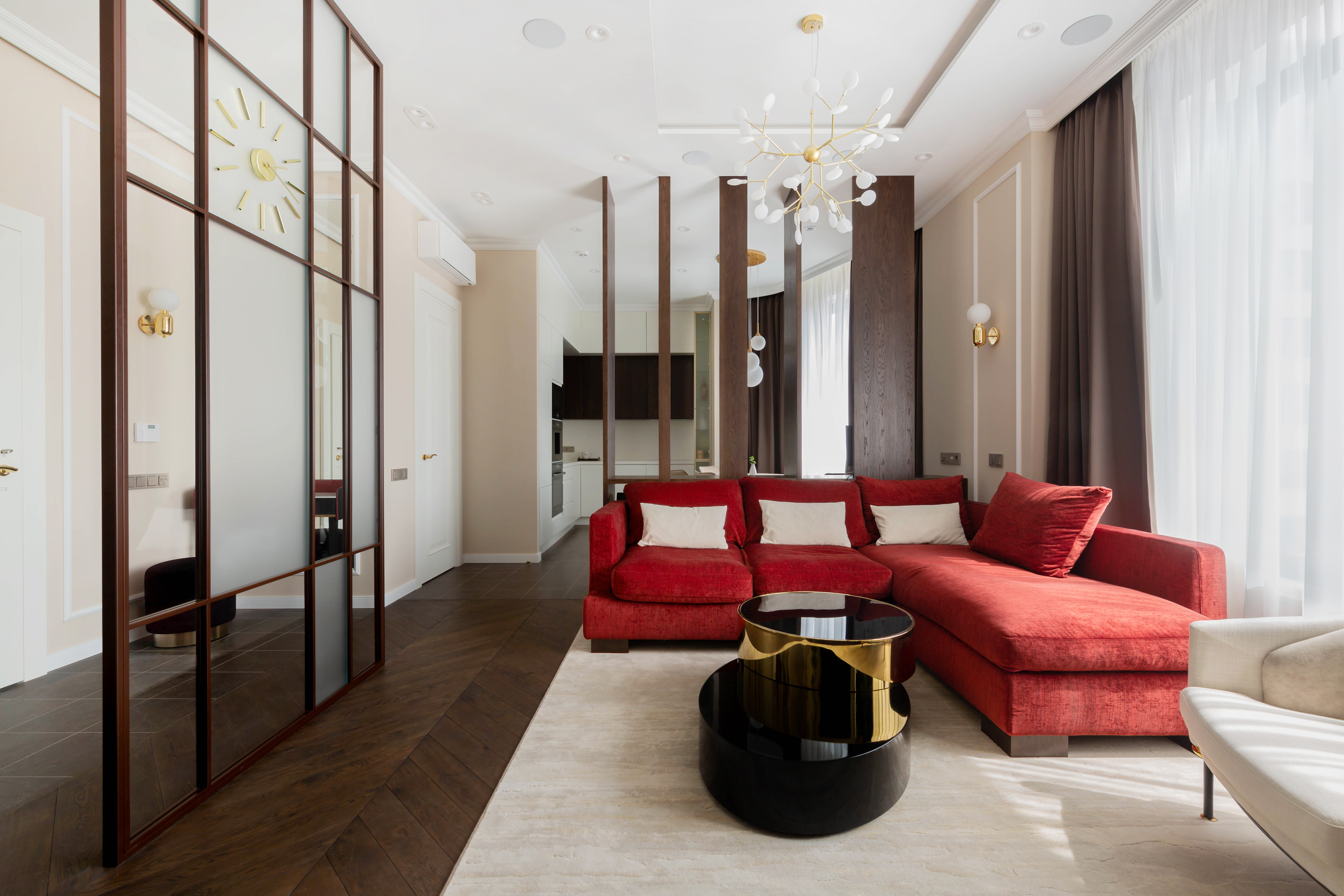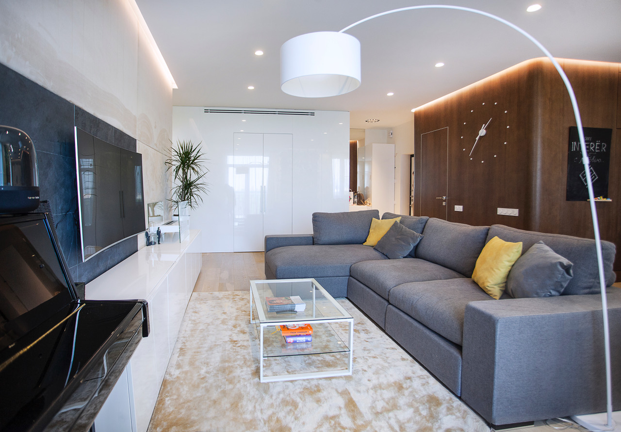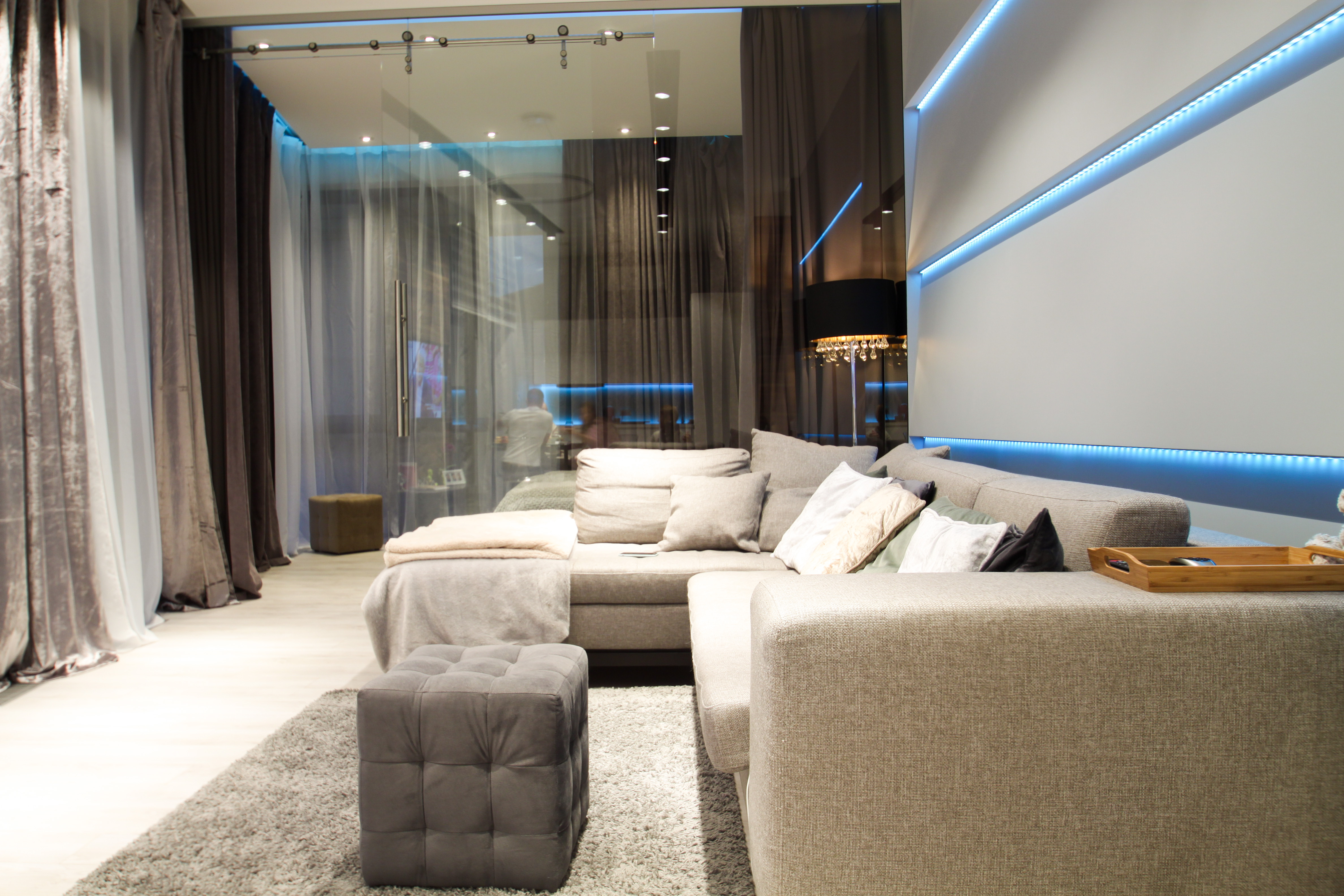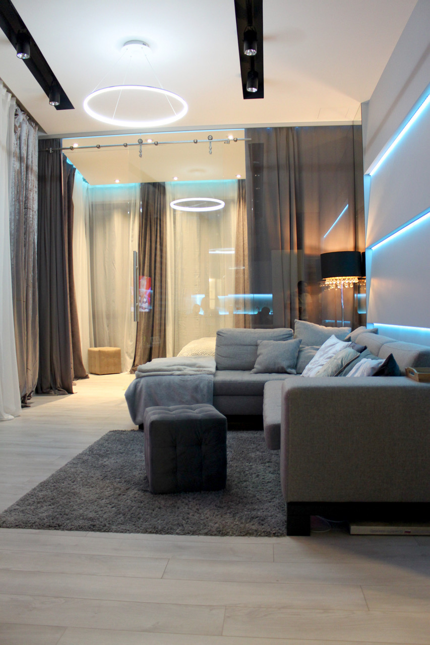 Ремонт квартиры в современном стиле для молодой семьи. Стеклянная стена в гостиной, встроенные в потолок гипсовые светильники, скрытые двери без наличников. Все пожелания и новинки мы внедрили, строго по проекту дизайн студии.