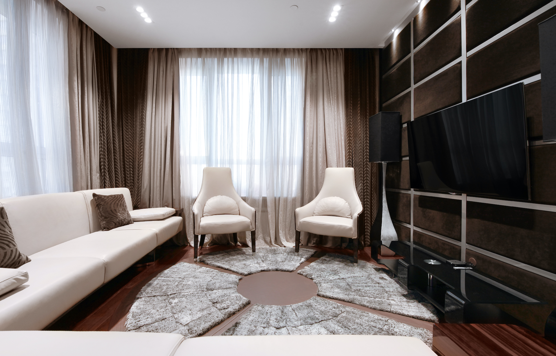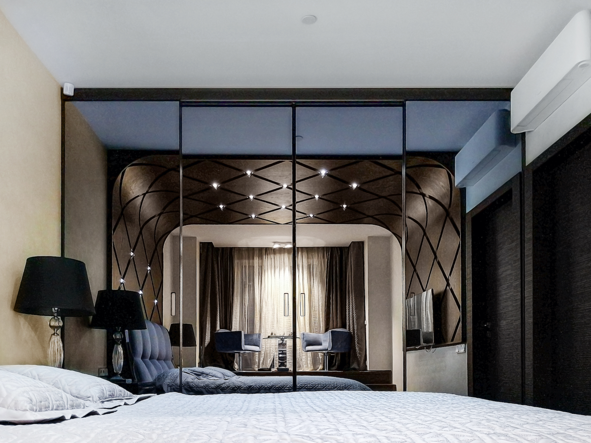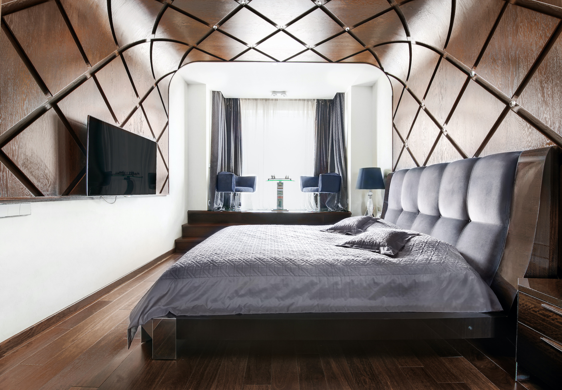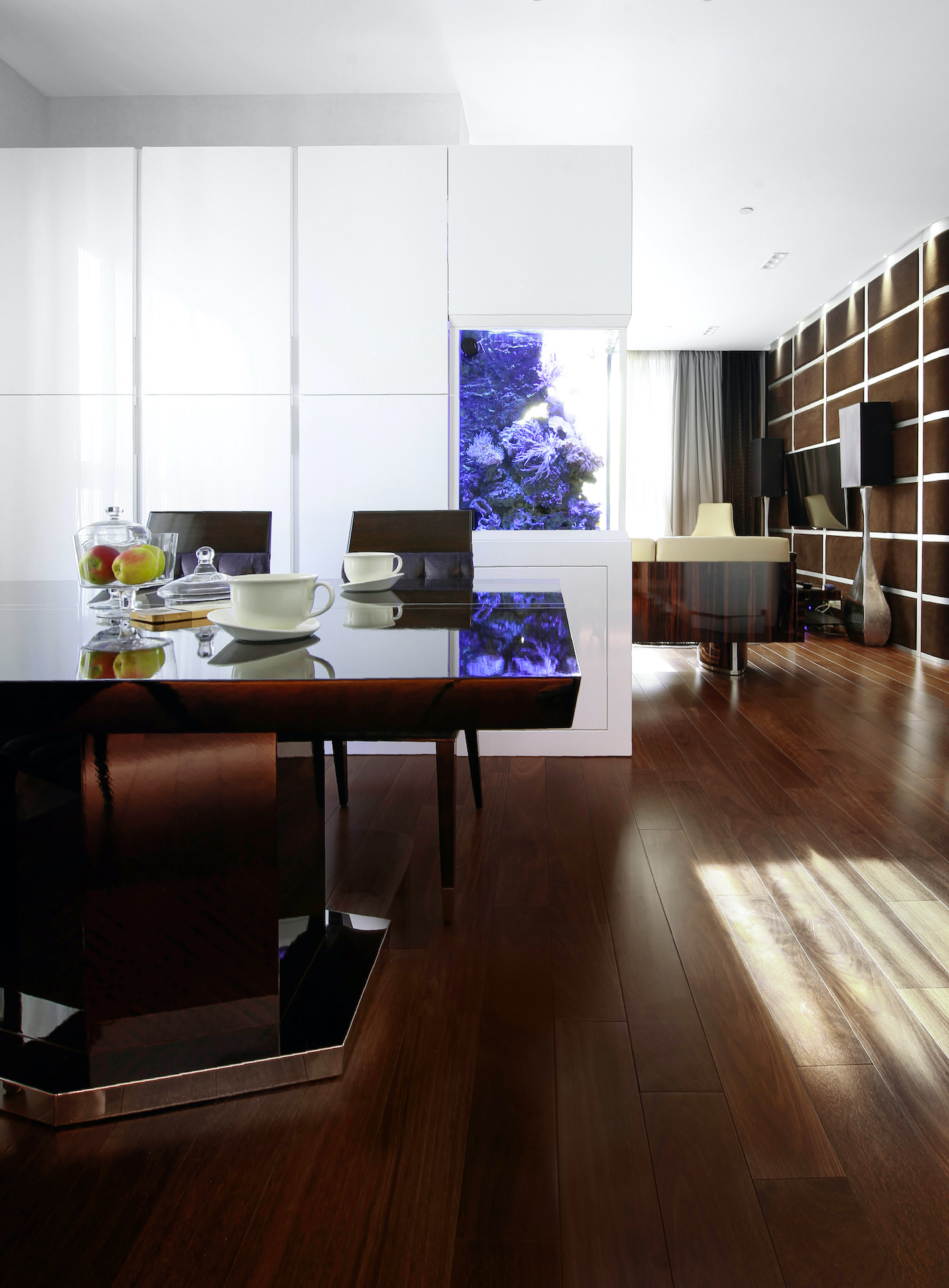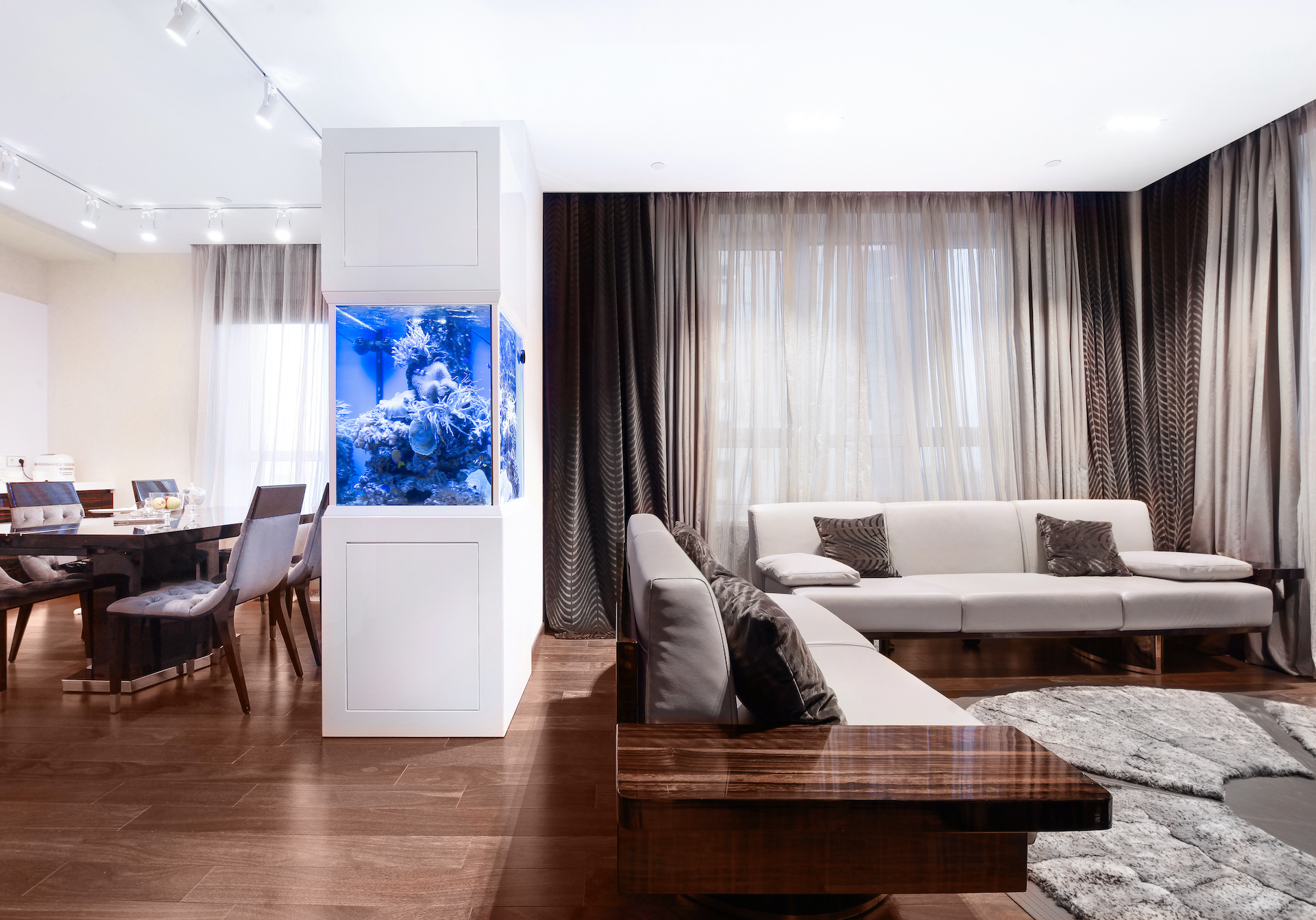 Премиум ремонт под ключ с использование современных дорогих материалов. Панели из алькантары, дерево с изгибом, морской аквариум.